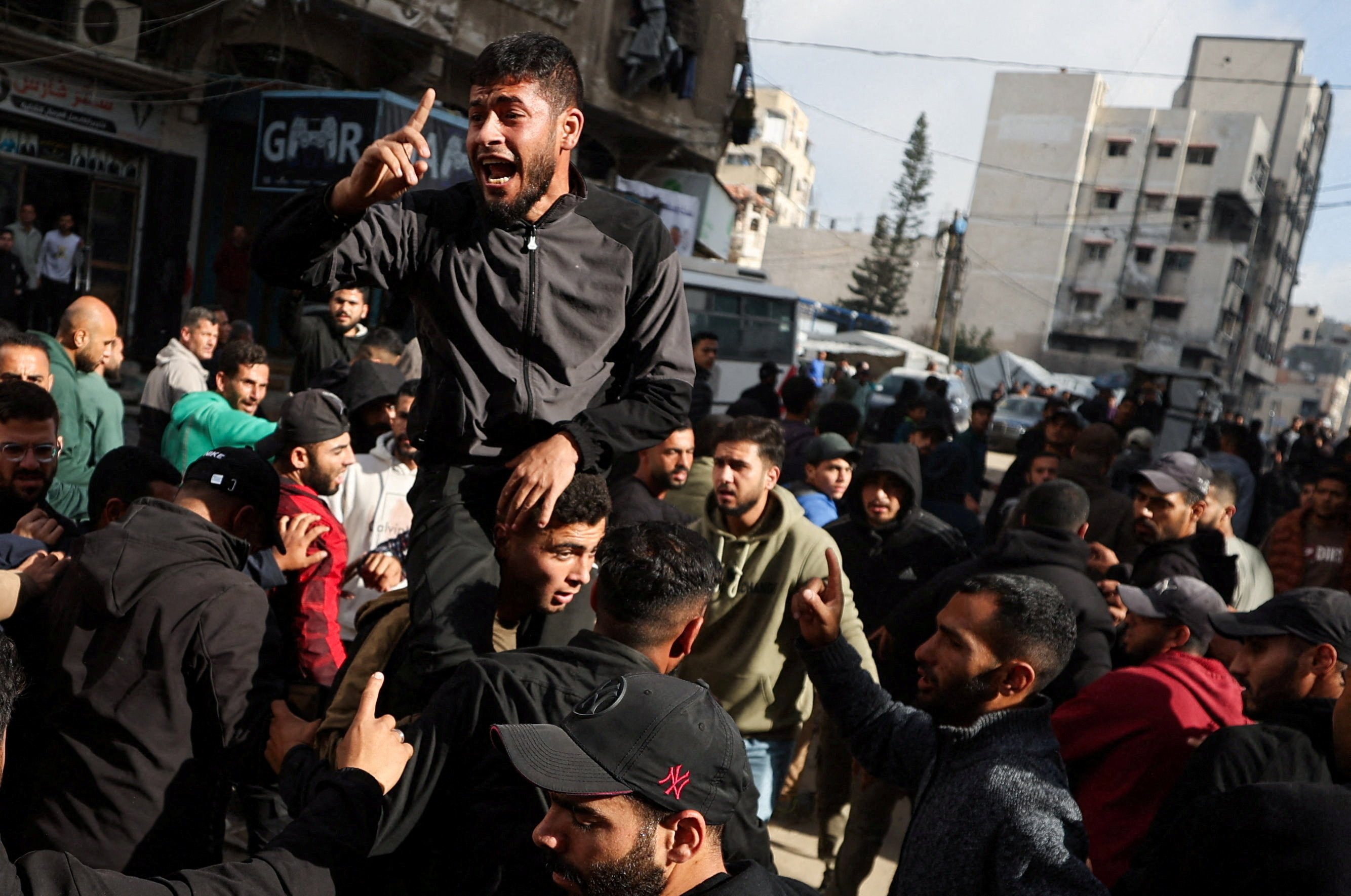 وفي مدينة غزة، تجمع عشرات الفلسطينيين لتشييع ثلاثة أشخاص استشهدوا في عدوان جوية إسرائيلية على مبنى سكني بالمنطقة مساء أمس.